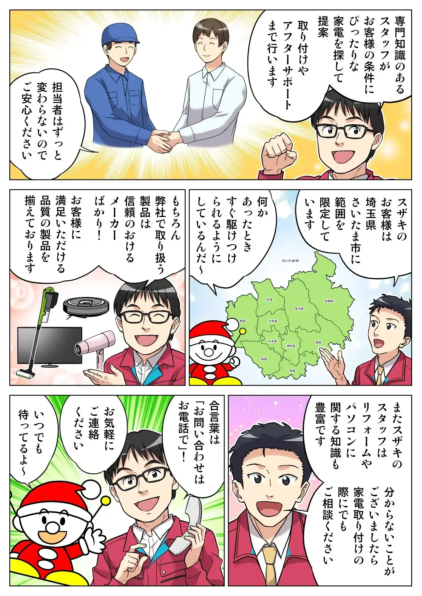スザキの会社概要を詳しく掲載しています。家電製品や住宅設備の訪問販売はスザキまでお気軽にご相談ください。お電話でのお問い合わせをお待ちしております。