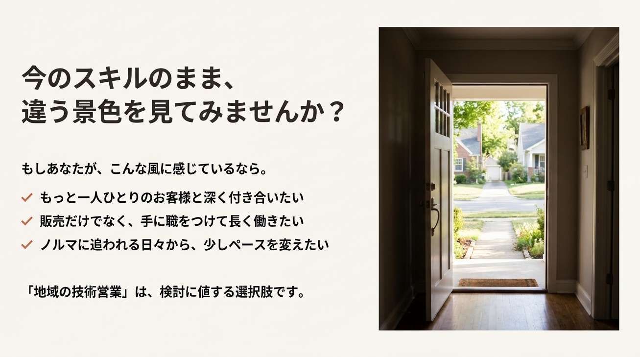 量販店での仕事も素晴らしいですが、もしあなたが、 「もっと一人ひとりのお客様と深く付き合いたい」 「販売だけでなく、手に職をつけて長く働きたい」 「ノルマに追われる日々から、少しペースを変えたい」 と感じているなら、「地域の電気屋(技術営業)」は、検討に値する選択肢の一つです。