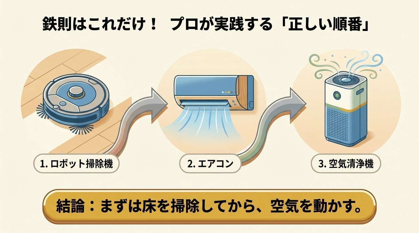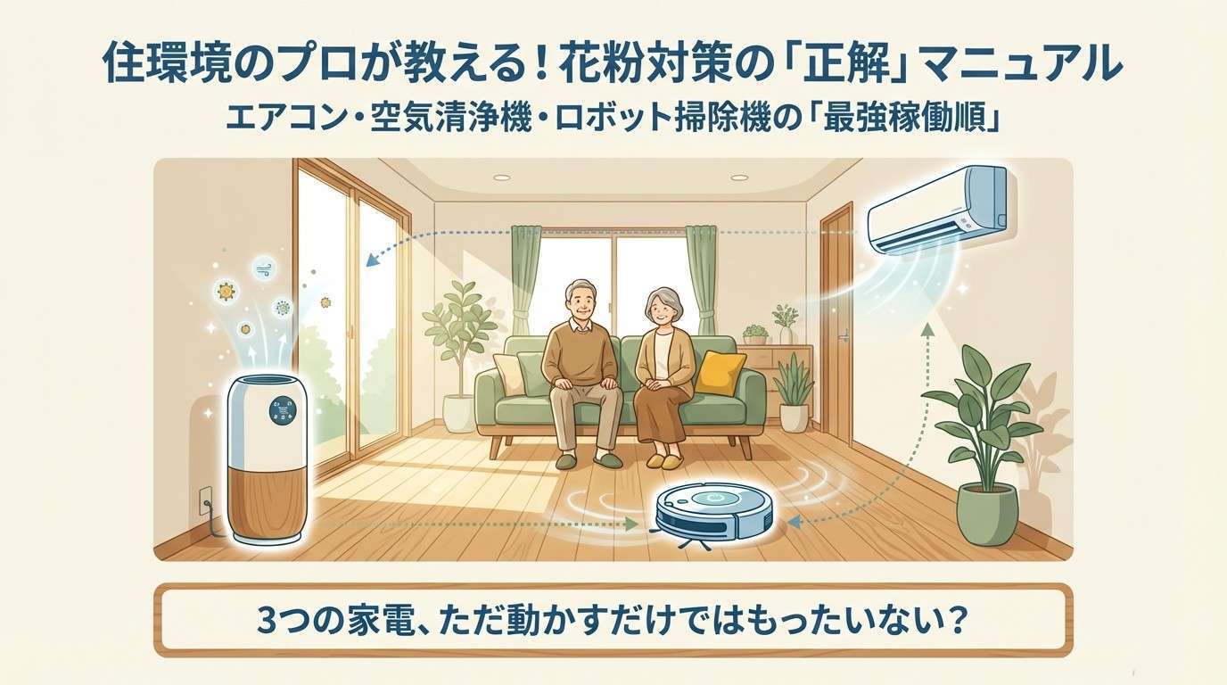 本記事では、住環境のプロの視点から、エアコン・空気清浄機・ロボット掃除機を使った「最も効率的に花粉を除去する稼働の順番」を解説します。