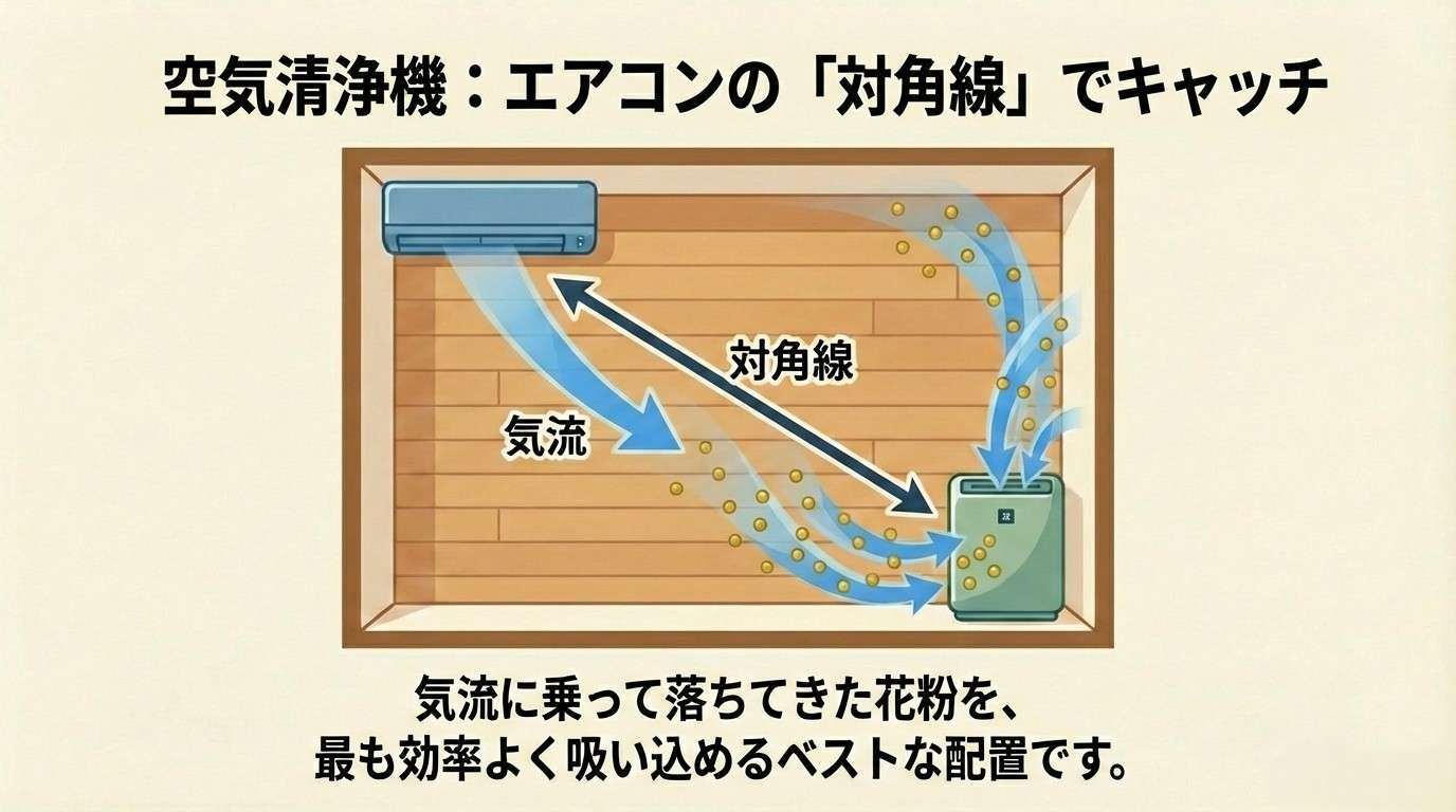エアコンが作り出した気流に乗って部屋を循環する花粉を、空気清浄機で一網打尽に吸い込みます。
