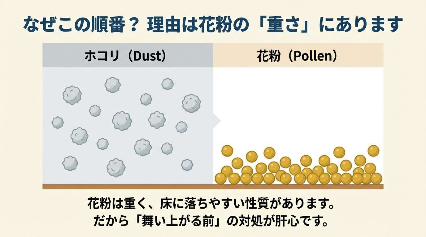 最大の理由は、人が動く前に、床に落ちた花粉を「舞い上げずに」取り除けるから。