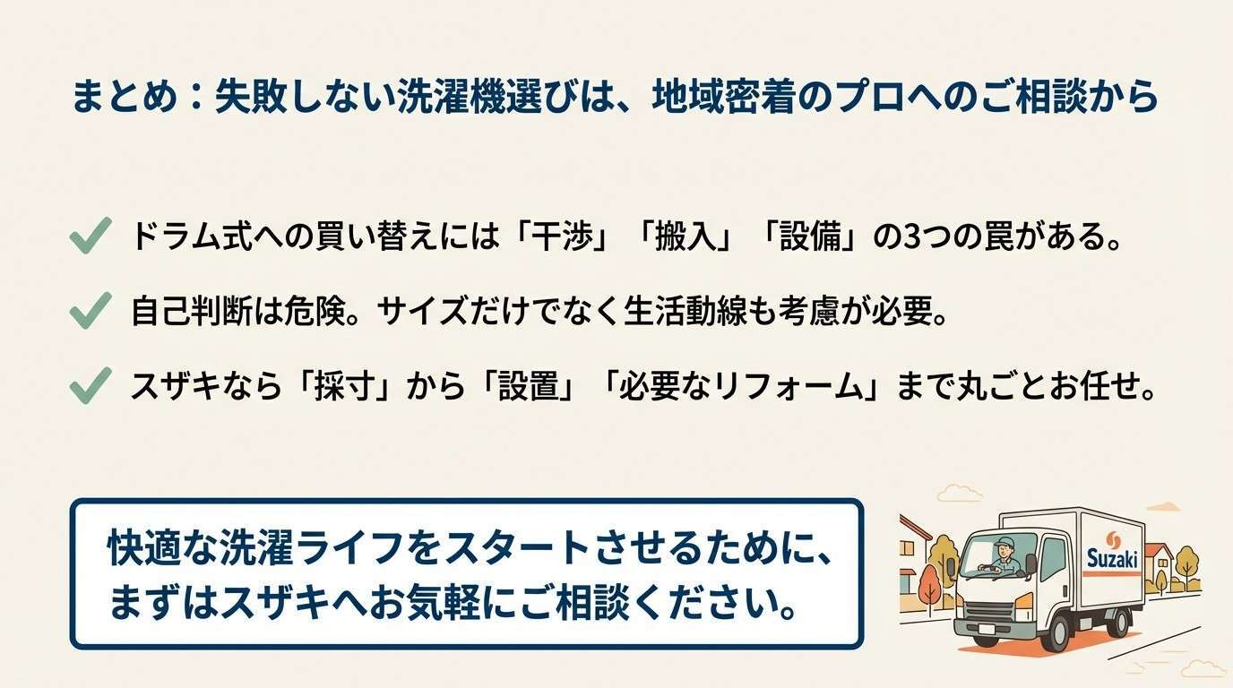 まとめ:失敗しない洗濯機選びは、地域密着のプロへのご相談から