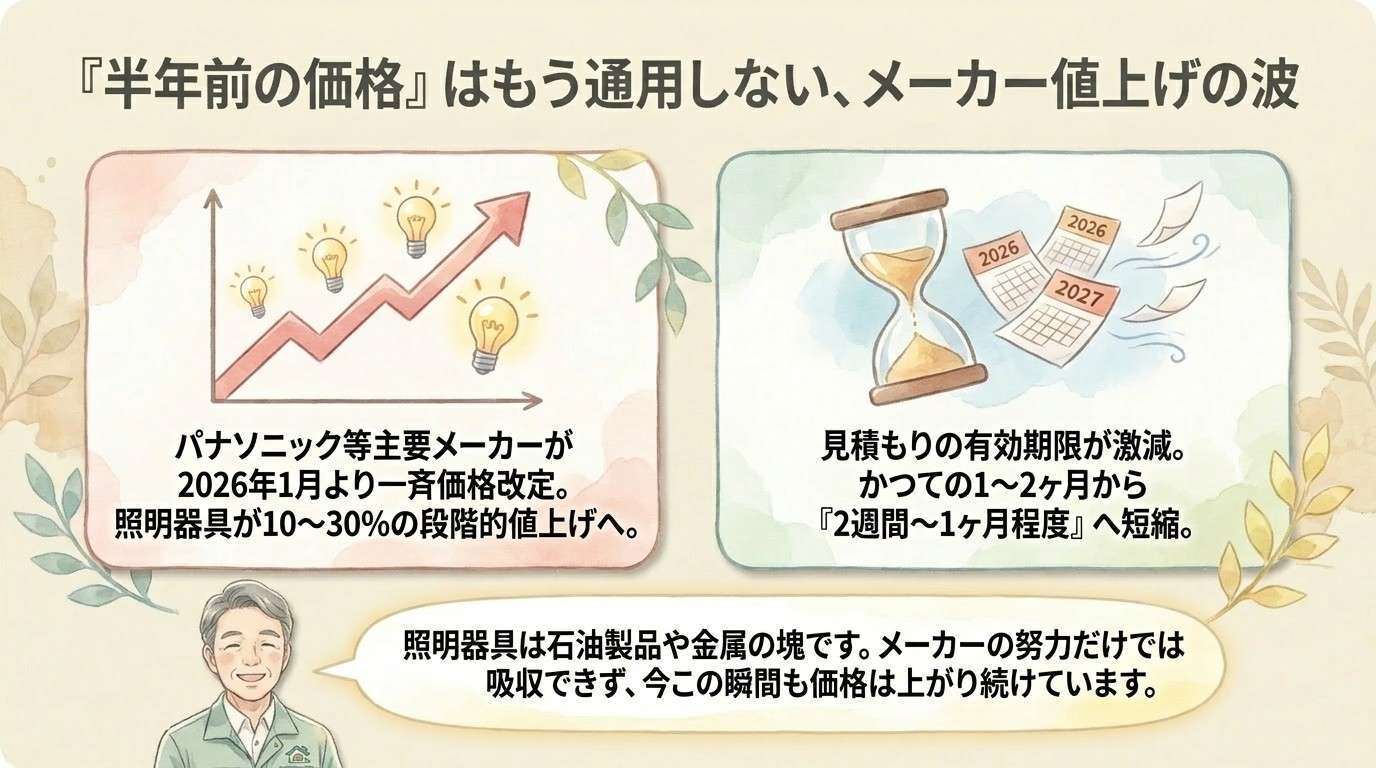 例えば、最大手のパナソニック株式会社エレクトリックワークス社は、照明器具および補修部品について2026年1月1日より一斉に価格改定を断行しました。